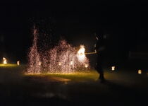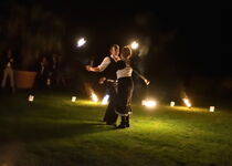 Nach dem Dessert versetzten die „Feuerwelten“ die Gäste mit einer sehr eindrucksvollen Feuershow im Freien in großes Entzücken, ohne dass es einer klimaschädlichen Pyrotechnik bedurft hätte. Die Vorstellung der „Feuerwelten“ war mehr als zirkusreif und rundet die überaus gelungene Geburtstagsfeier ab.